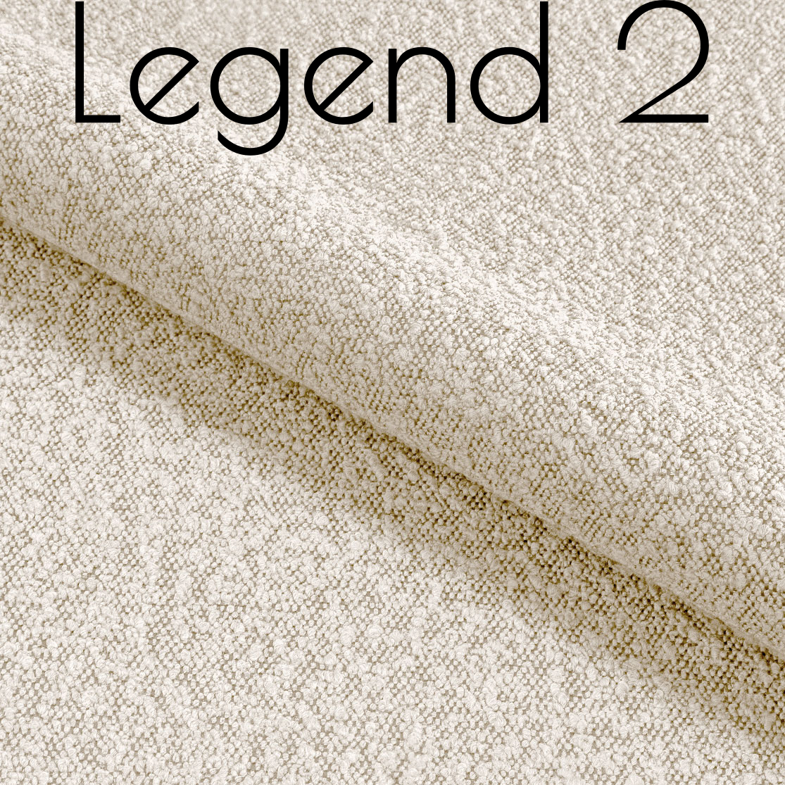 Tkanina Legend o charakterystycznym splocie boucle jest bardzo przyjemna w dotyku. Obite nią meble pasują do większości klasycznych wnętrz. Jest bardzo uniwersalna i wytrzymała - jej odporność na ścieranie to ponad 100 tysięcy suwów. Należy do ciężkich tkanin - jej gramatura wynosi 650 g/m2. Wykonana jest w całości z poliestru i została przebadana na zawartość szkodliwych substancji. Spełnia normy dyrektywy REACH.